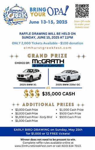 Hosted by The Greek Orthodox Church of Saint Demetrios, Greek Fest Elmhurst is a vibrant celebration of Greek culture, food, and tradition. Enjoy authentic Greek cuisine and pastries, live music, exciting raffle prizes, and family-friendly games. Explore the beauty of our faith with guided church tours, and unwind with drinks from our full bar. Whether you’re here for the delicious food, the festive atmosphere, or the warm hospitality, Greek Fest Elmhurst promises a memorable experience for all!